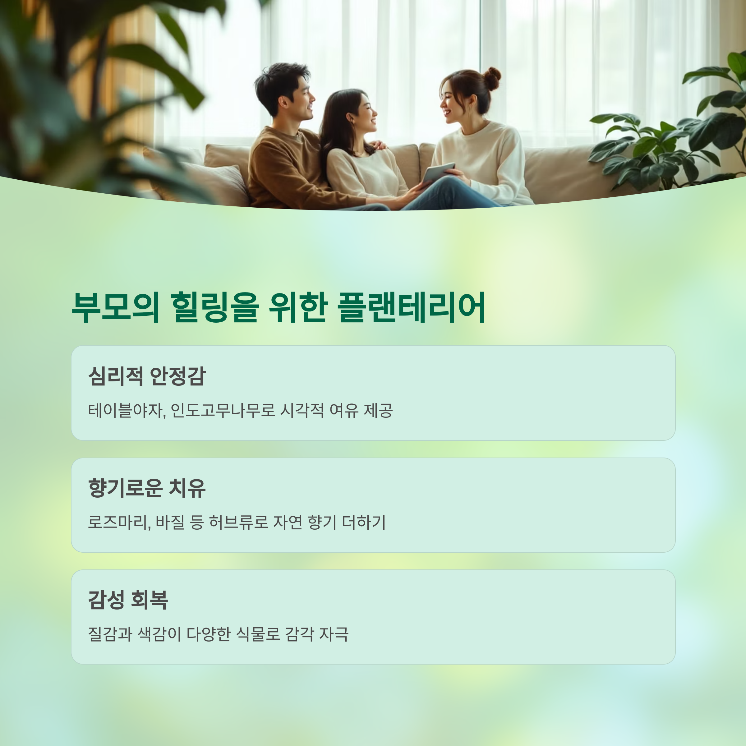 식물은 단지 인테리어 소품이 아닙니다. 심리적 안정감과 정서 회복에 도움을 주는 존재입니다. 특히 거실처럼 하루의 피로를 풀고 휴식을 취하는 공간에 자연을 들이는 것은 부모의 스트레스 완화에 효과적입니다.