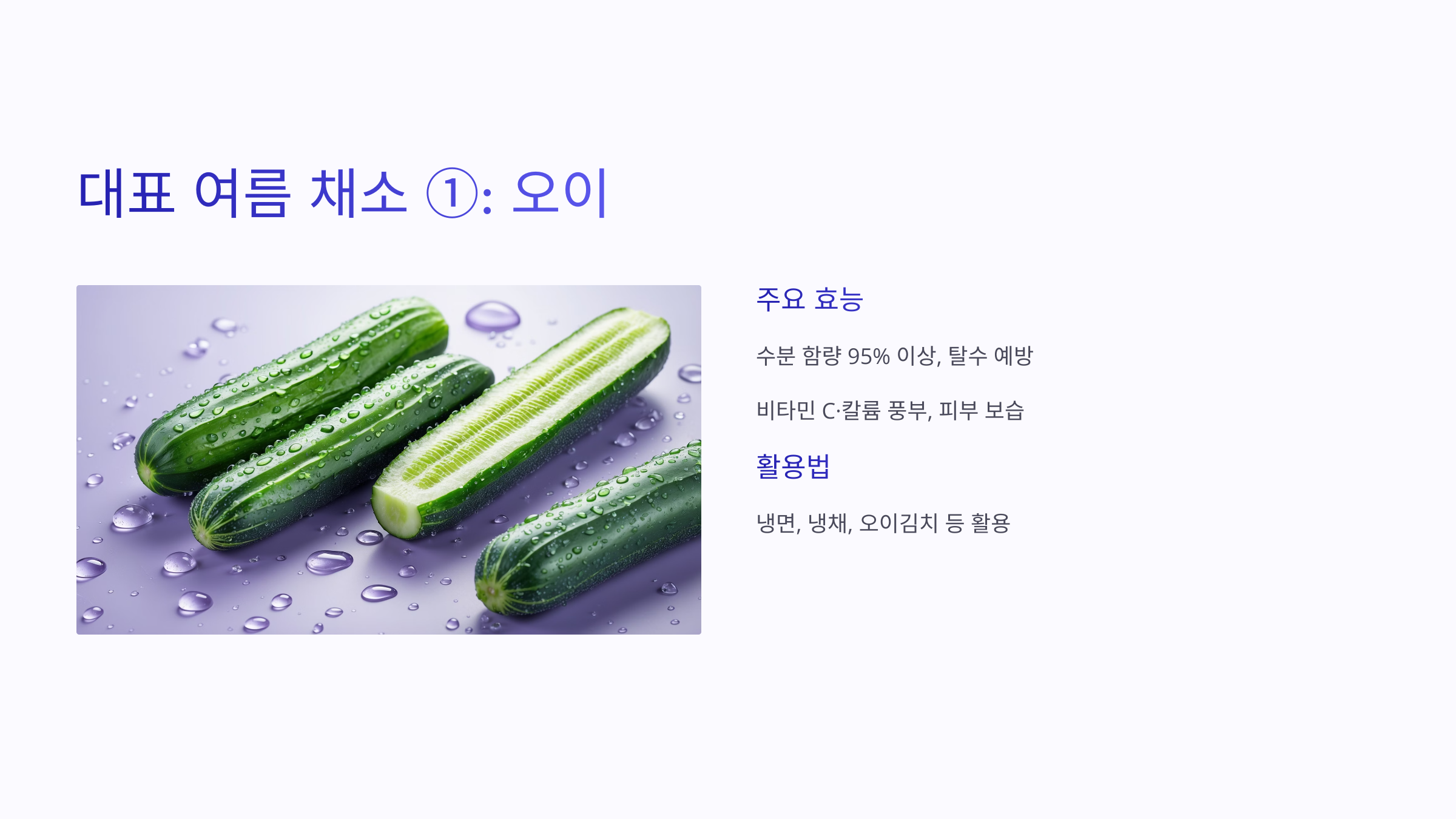 수분 함량이 매우 높고 열을 내려주는 대표적인 여름 채소입니다. 생으로 먹거나 냉국, 무침 등 다양한 요리로 활용 가능합니다.