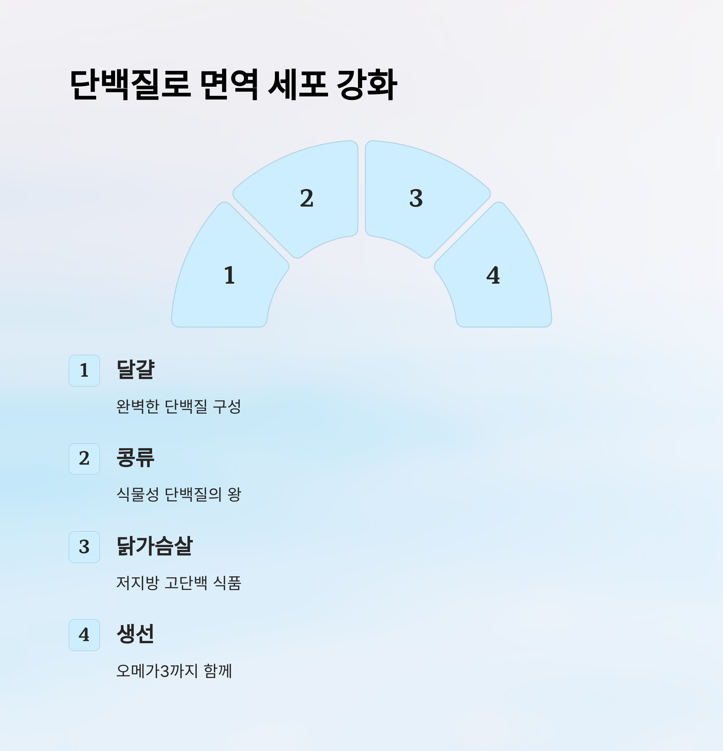 | 단백질 식품 | 달걀, 콩류, 닭가슴살 | 세포 회복에 도움 |