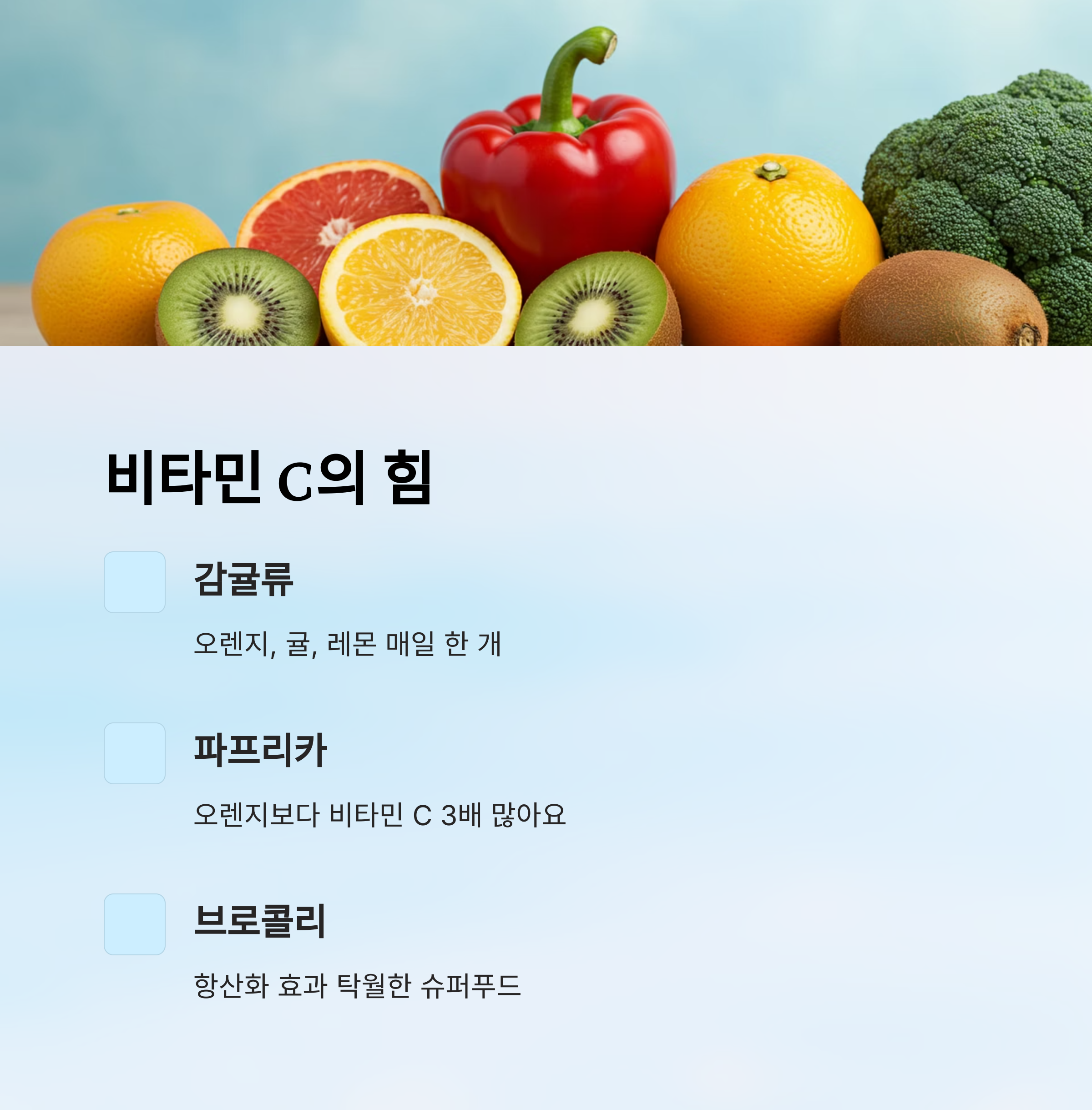 | 비타민 C 식품 | 감귤류, 파프리카, 브로콜리 | 항산화 효과 탁월 |