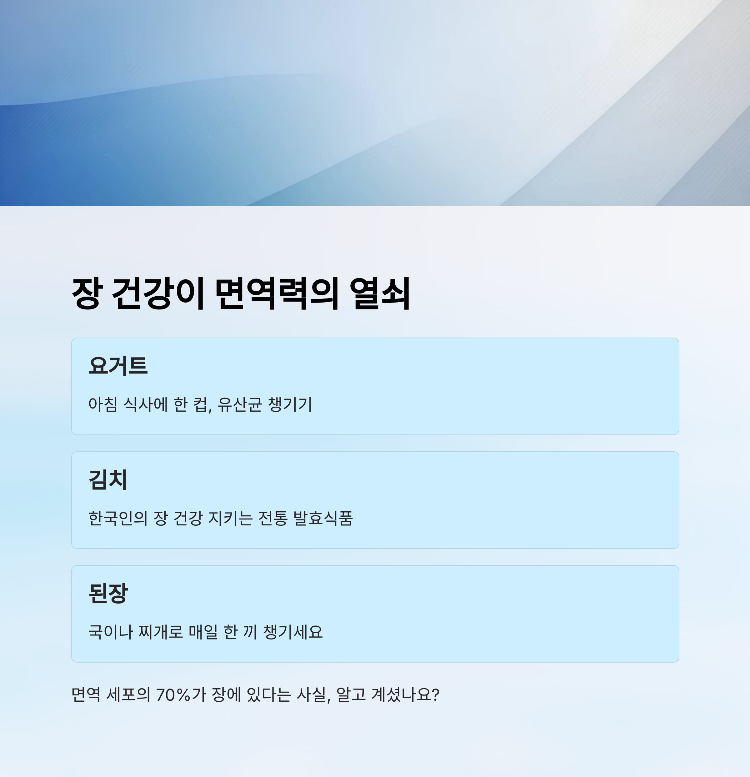 장 건강은 면역력에 밀접한 영향을 줍니다. 발효식품을 자주 섭취해보세요